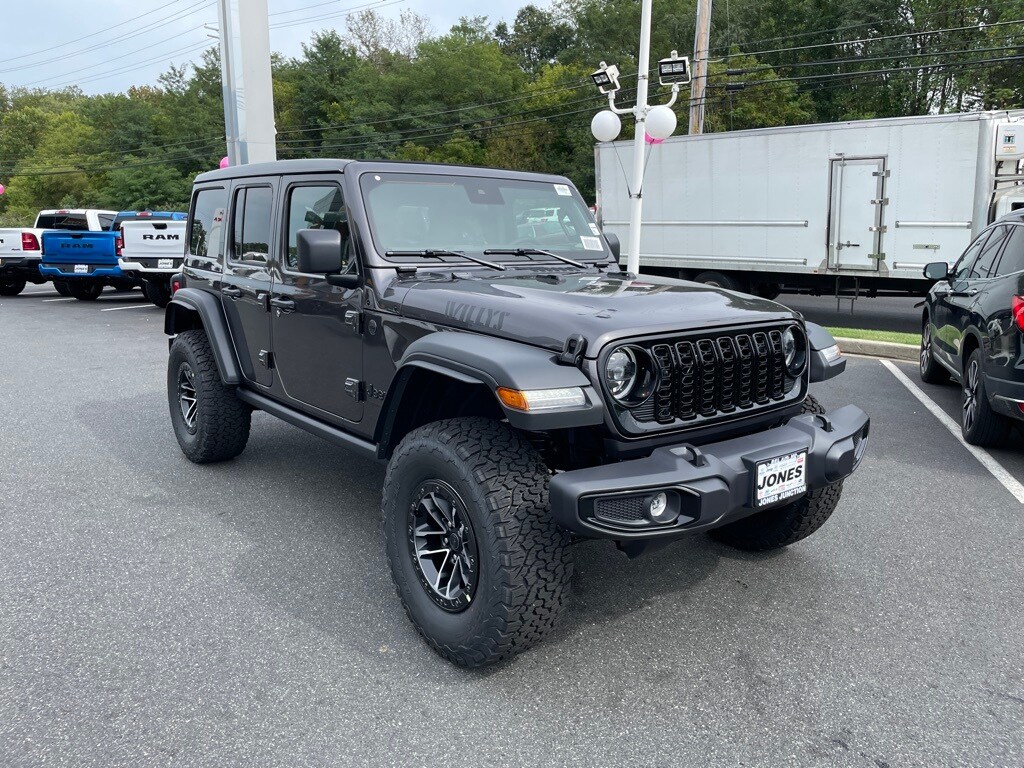 Quick Order Package 24W Willys (4-Wheel Drive Swing Gate Decal, 7 & 4 Pin Wiring Harness, 97 MPH Vehicle Max Speed Calibration, Advanced Brake Assist, Automatic Headlamps, Auxiliary Switches, Black Grille, Class II Receiver Hitch, Conventional Differential Front Axle, Corning Gorilla Glass, Dana M210 Wide HD Tube Front Axle, Dana M220 Wide Rear Axle, Daytime Running Lamps LED Accents, Deep Tint Sunscreen Windows, E-Locker Rear Axle, Enhanced Adaptive Cruise Control, Front LED Fog Lamps, Full Speed Forward Collision Warning Plus, Injection Molded Black Rear Bumper, LED Premium Reflector Headlamps, Mold In Color Bumper w/Gloss Black, Molded in Color Rubicon Highline Flare, MOPAR All-Weather Floor Mats, Off-Road Plus Mode, Power Heated Mirrors, Premium Wrapped Steering Wheel, Security Alarm, Sun Visors w/Illuminated Vanity Mirrors, Wheels: 17" x 7.5" Painted Black, Willy's Suspension, and Willys Hood Decal), Xtreme 35" Tire Package (35" Tire Suspension, Anti-Lock 4-Wheel Disc Perf Brakes, MOPAR Hinge-Gate Reinforcement, Wheel Flare Extensions, and Wheels: 17" x 8" Machined w/Black Pockets), 110 MPH Vehicle Max Speed Calibration, 4-Wheel Disc Brakes, 8 Speakers, ABS brakes, Air Conditioning, AM/FM radio: SiriusXM, Apple CarPlay/Android Auto, Aux Battery, Brake assist, Cloth Low-Back Bucket Seats, Compass, Delay-off headlights, Driver door bin, Driver vanity mirror, Dual front impact airbags, Dual front side impact airbags, Electronic Stability Control, Front anti-roll bar, Front Bucket Seats, Front Center Armrest w/Storage, Front fog lights, Front reading lights, Illuminated entry, Integrated roll-over protection, Jeep Trail Rated Kit, Low tire pressure warning, Non-Lock Fuel Cap w/o Discriminator, Normal Duty Suspension, Occupant sensing airbag, Outside temperature display, Overhead airbag, Panic alarm, ParkView Rear Back-Up Camera, Passenger door bin, Passenger vanity mirror, Power steering, Power Top Quarter Window Storage Bag, Power windows, Radio data system, Radio: Uconnect 5 w/12.3" Display, Rear anti-roll bar, Rear reading lights, Rear Window Defroster, Rear Window Wiper/Washer, Remote keyless entry, Removable Rear Quarter Windows, Sky 1-Touch Power Top, Speed control, Split folding rear seat, Steering wheel mounted audio controls, Stop-Start Dual Battery System, Tachometer, Telescoping steering wheel, Tilt steering wheel, Traction control, Trip computer, Variably intermittent wipers, and Wheels: 17" x 7.5" Black Steel Styled.